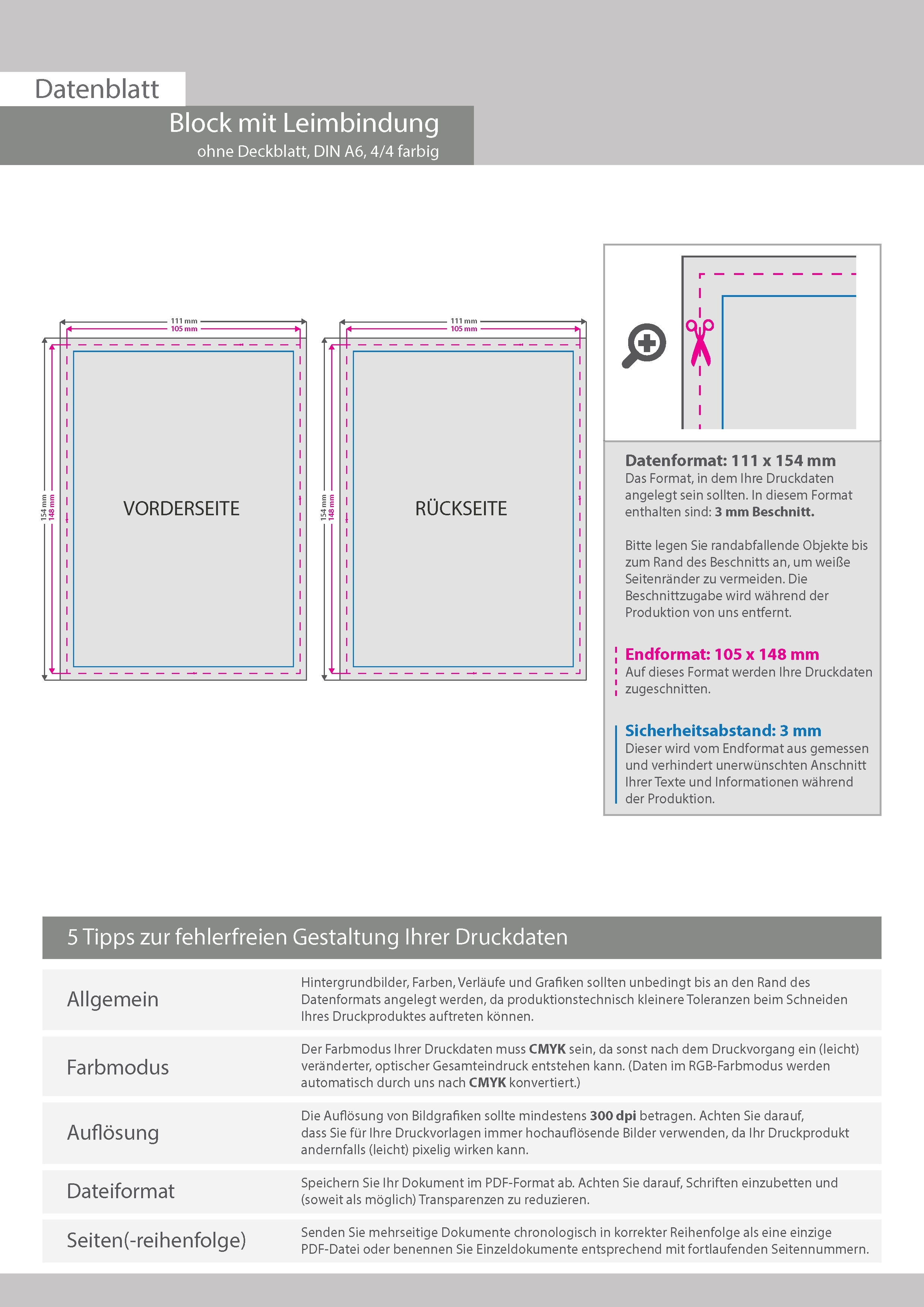 Block mit Leimbindung, DIN A6, 50 Blatt, 4/4 farbig beidseitig bedruckt