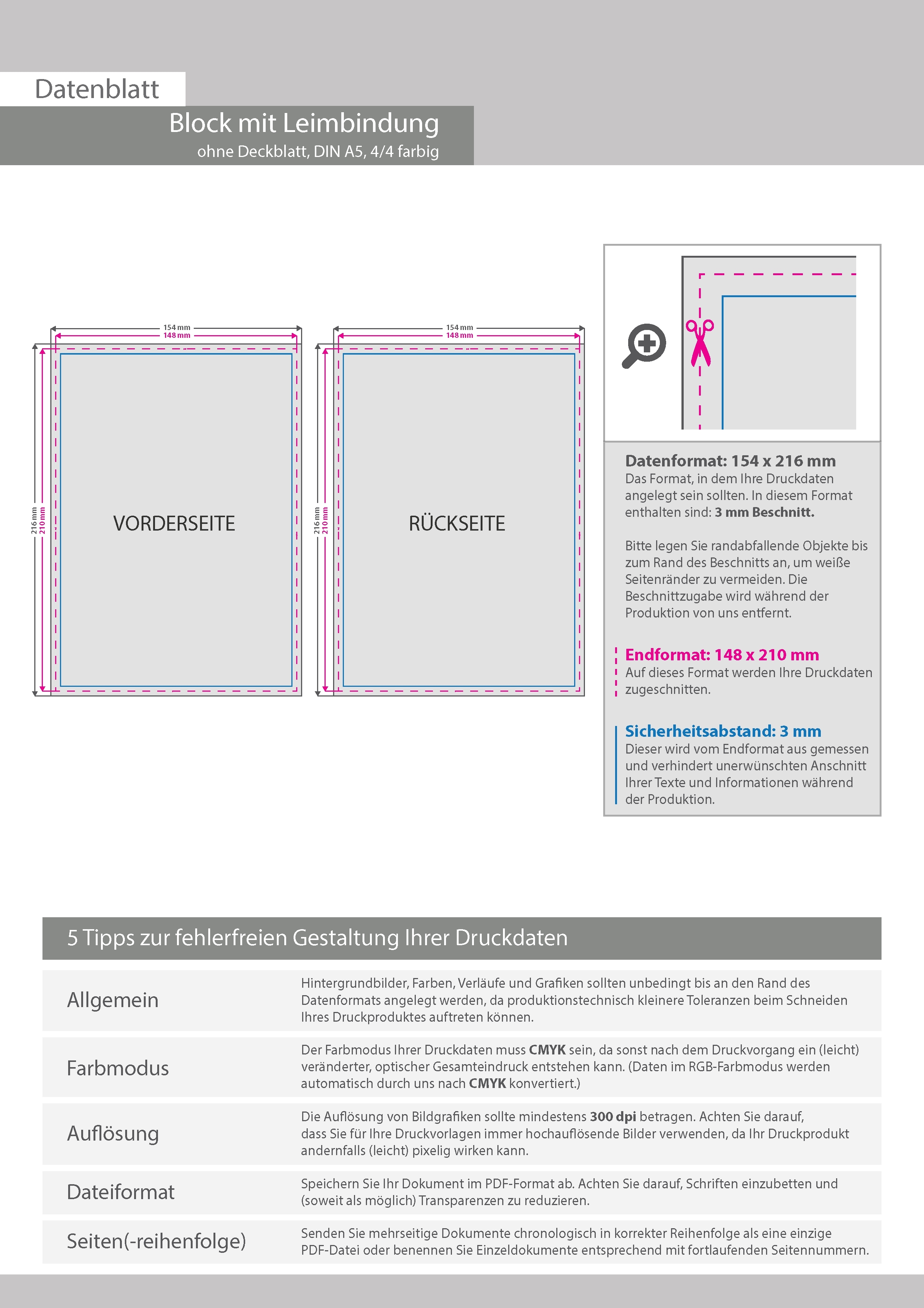 Block mit Leimbindung, DIN A5, 100 Blatt, 4/4 farbig beidseitig bedruckt