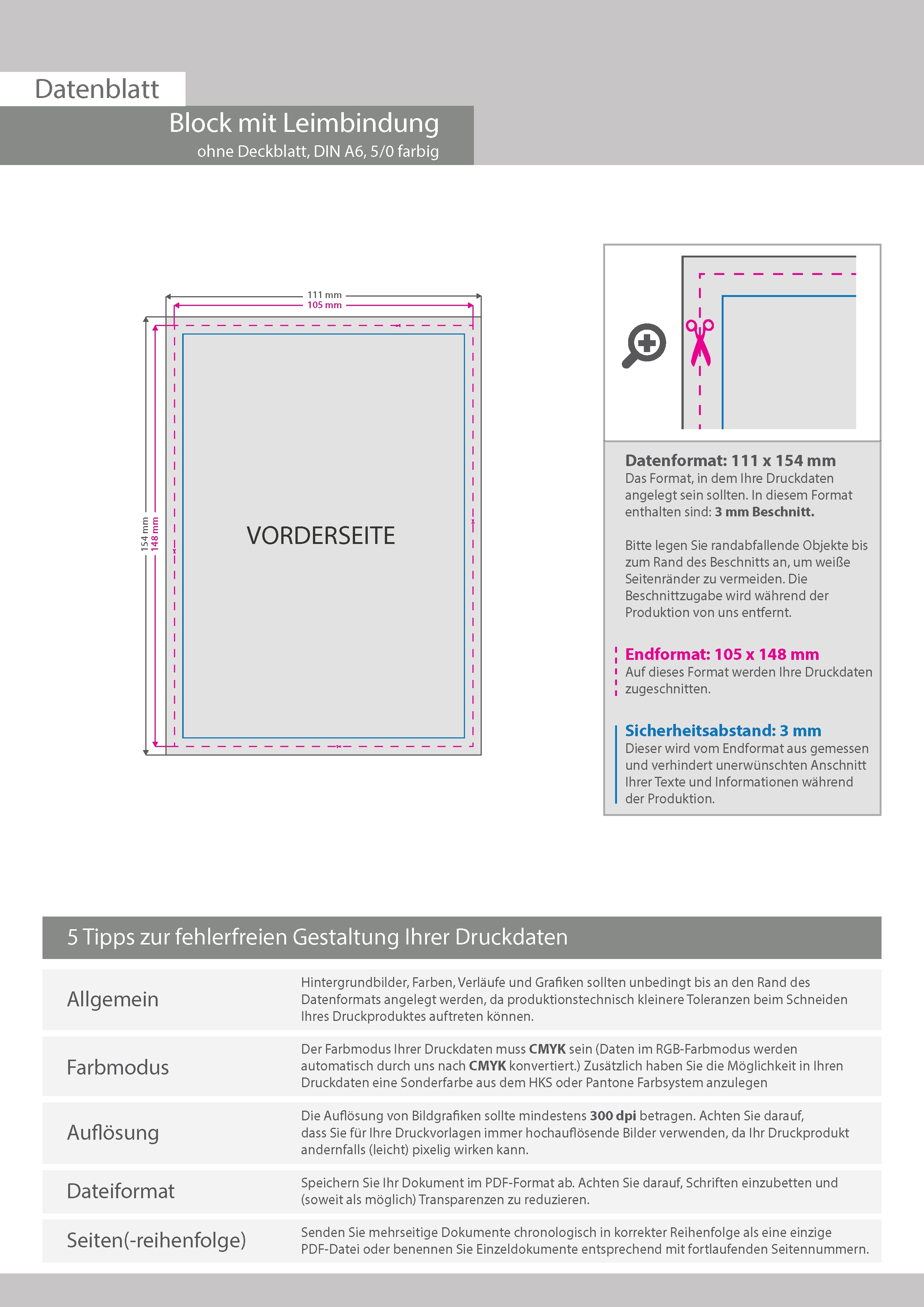 Block mit Leimbindung, DIN A6, 25 Blatt, 5/0 farbig einseitig bedruckt (CMYK 4-farbig + 1 Sonderfarbe HKS oder Pantone)