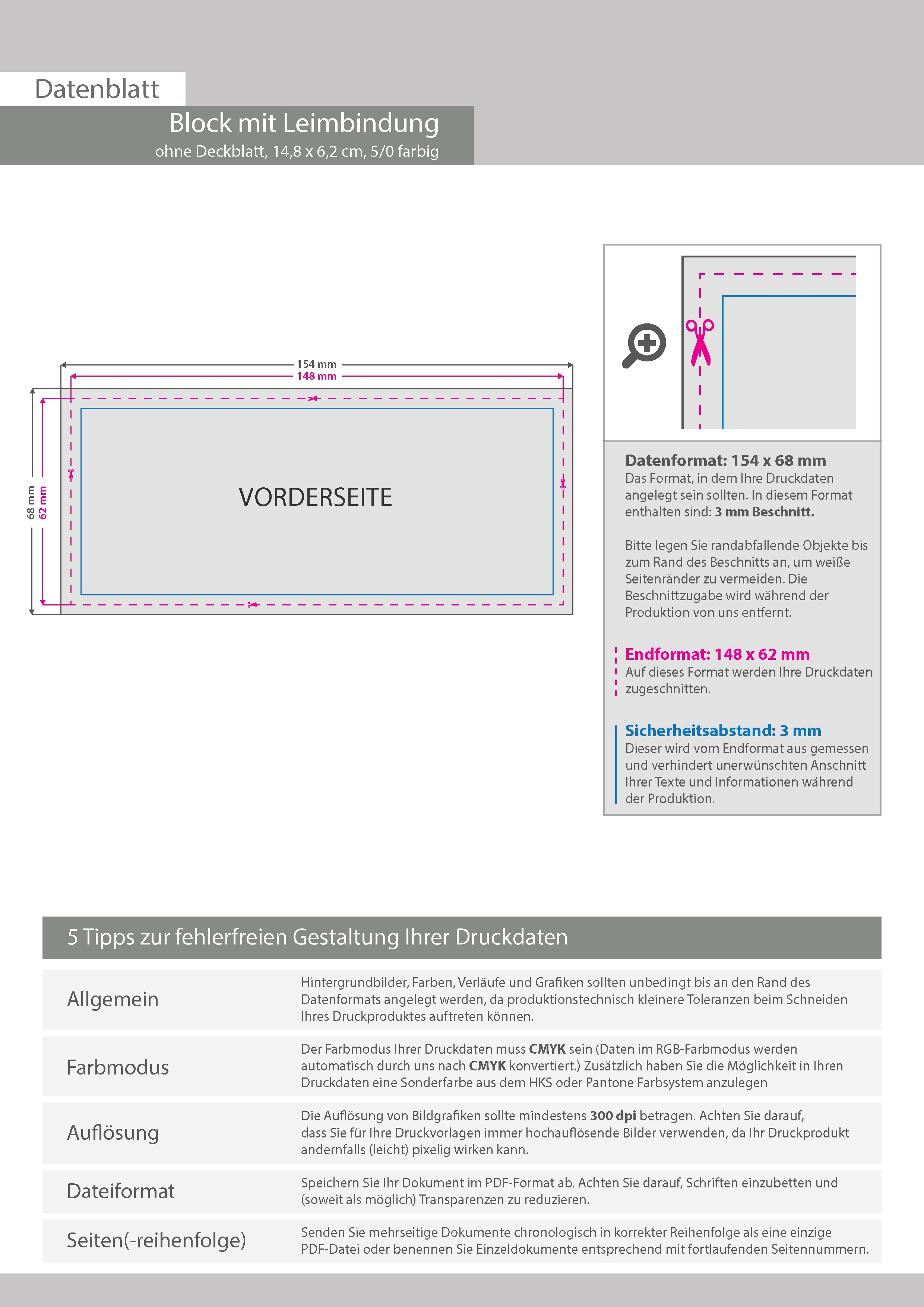 Block mit Leimbindung, 14,8 cm x 6,2 cm, 200 Blatt, 5/0 farbig einseitig bedruckt (CMYK 4-farbig + 1 Sonderfarbe HKS oder Pantone)