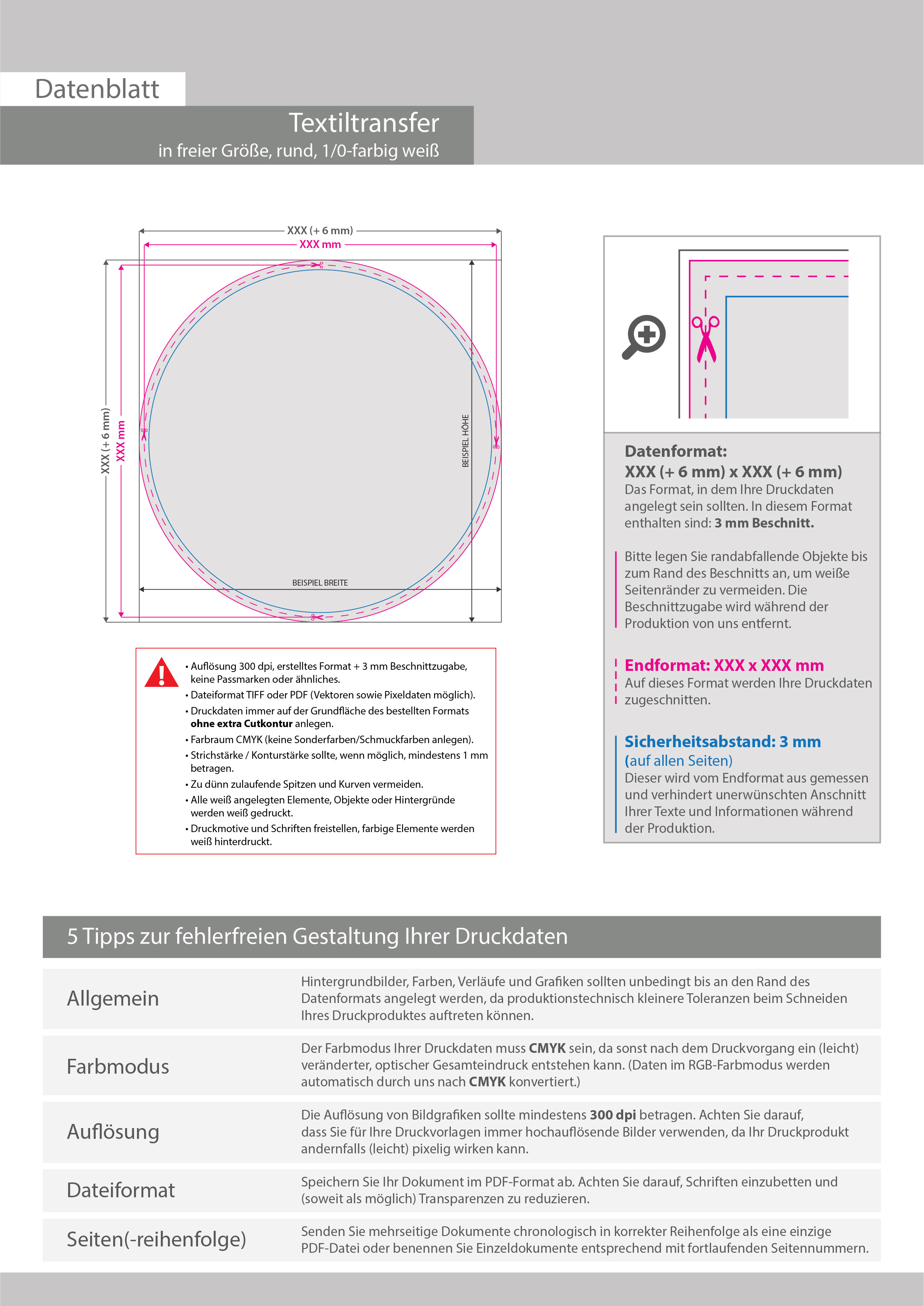 Hochwertiger Textiltransfer in freier Größe (rund), einseitig 1/0-farbig (weiß) bedruckt