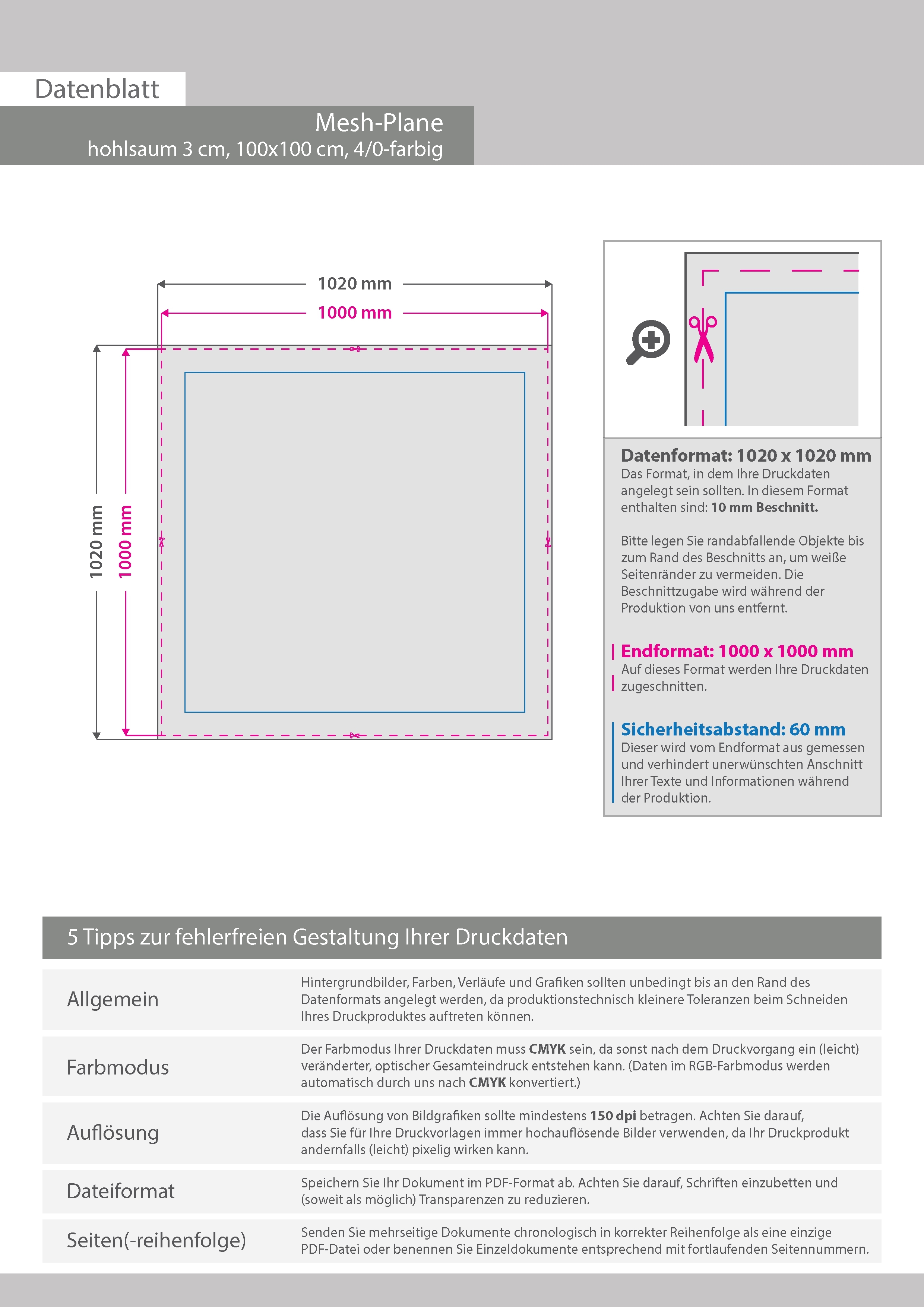 Hochwertige Mesh-Plane (PVC-frei), 100 x 100 cm, 4/0-farbig bedruckt, Hohlsaum links und rechts (Durchmesser Hohlsaum 3,0 cm)